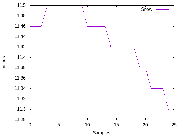 Maxbotix Ultrasonic Rangefinder Total Snow Depth accumulated on snow board.Plot below is for the past hour.